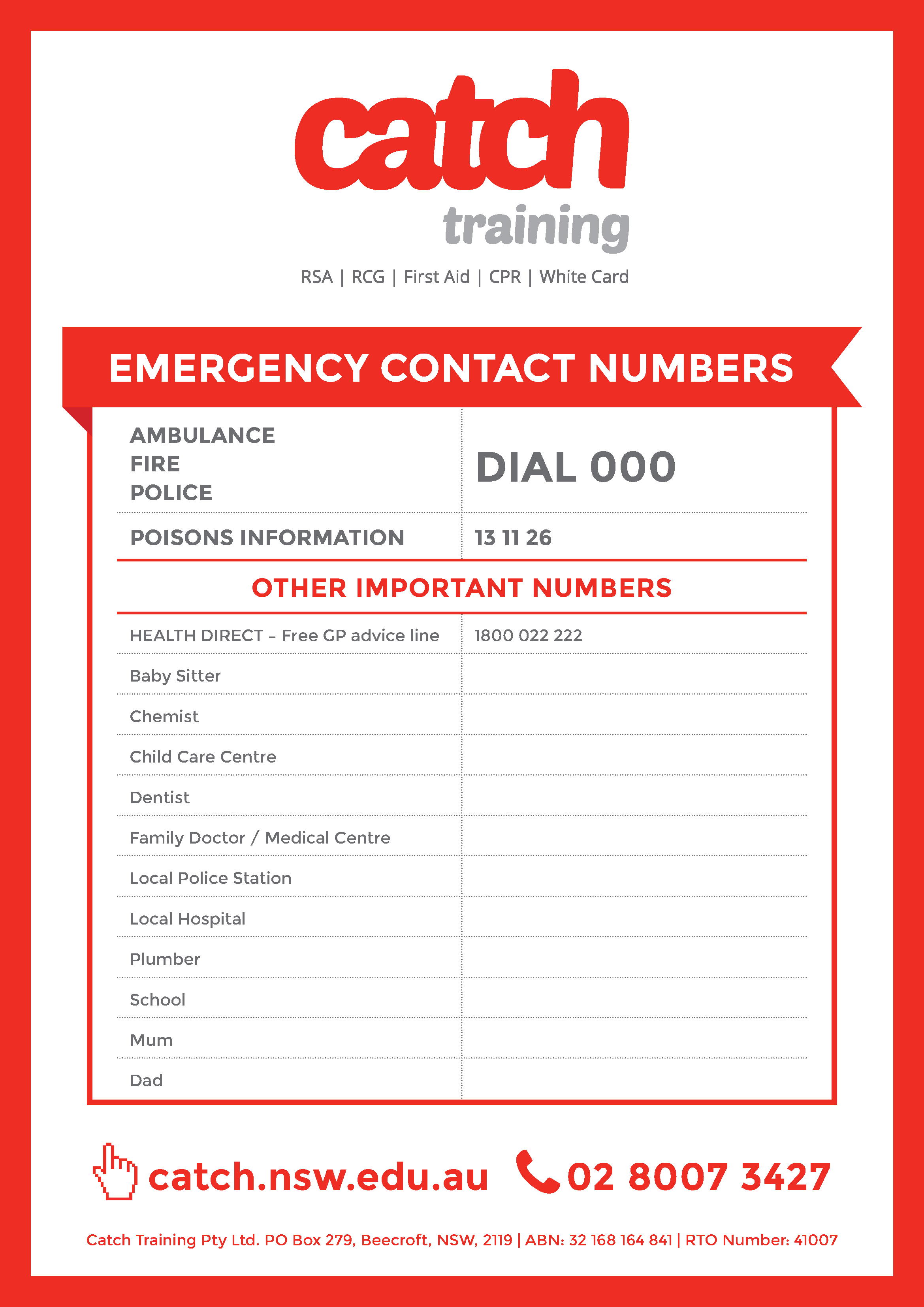 Please find below the Emergency Contact Numbers poster free printable. Just click the image to download, print and complete with your important numbers. Then mount it somewhere noticeable such as the fridge or a notice board.